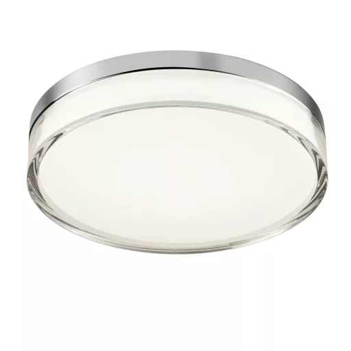 28cm átmérőjű, króm színű fém vázas mennyezeti lámpa kívül átlátszó, belül opálos PMMA búrával, változtatható, meleg vagy természetes fehér(3000/4000K) színhőmérsékletű beépített LED fényforrással, IP44-es védelemmel.