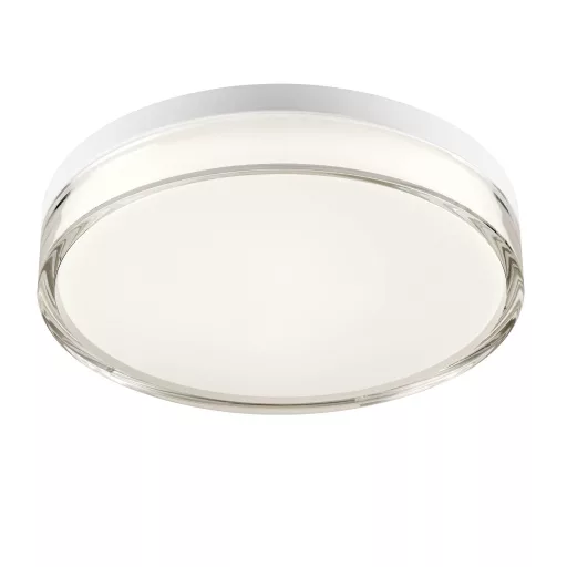 28cm átmérőjű, fehér színű fém vázas mennyezeti lámpa kívül átlátszó, belül opálos PMMA búrával, változtatható, meleg vagy természetes fehér(3000/4000K) színhőmérsékletű beépített LED fényforrással, IP44-es védelemmel.