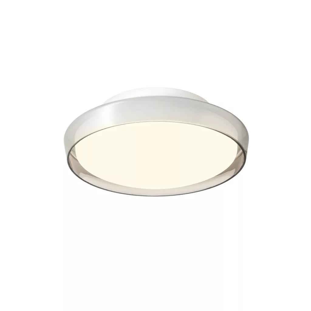 25cm átmérőjű, matt fehér színűre festett alumínium vázas mennyezeti lámpa kívül füstös, belül opálos üveg búrával, beépített LED fényforrással, IP44-es védelemmel. A lámpa színhőmérséklete állítható meleg, vagy természetes fehér színre, azaz 3000 vagy 4000Kelvinre.