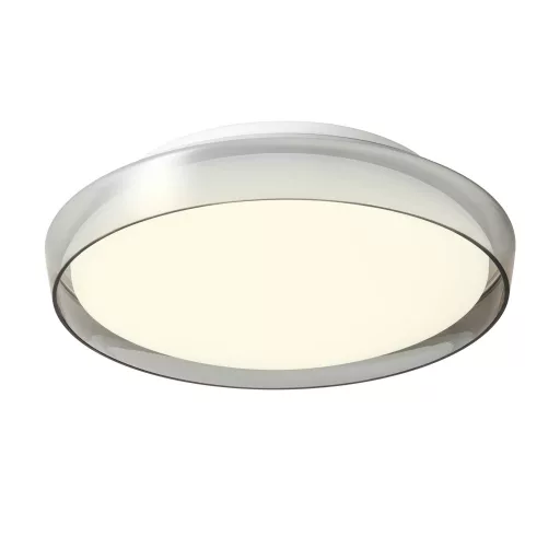 35cm átmérőjű, matt fehér színűre festett alumínium vázas mennyezeti lámpa kívül füstös, belül opálos üveg búrával, beépített LED fényforrással, IP44-es védelemmel. A lámpa színhőmérséklete állítható meleg, vagy természetes fehér színre, azaz 3000 vagy 4000Kelvinre.
