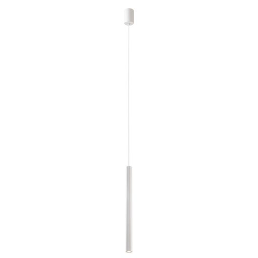 Matt fehér színű fém és alumínium függesztett lámpa 35cm hosszú, 2,6cm átmérőjű bordázott cső búrával, meleg színhőmérsékletű beépített LED fényforrással.