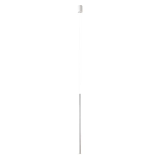 Matt fehér színű fém és alumínium függesztett lámpa 75cm hosszú, 2,6cm átmérőjű bordázott cső búrával, meleg színhőmérsékletű beépített LED fényforrással.