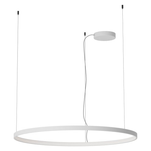 Kerek függesztett lámpa matt fehér színű fém és alumínium vázzal, 100cm átmérőjű opálos szilikon betétes búrával, beépített LED fényforrással. A lámpa színhőmérséklete állítható meleg, vagy természetes fehér (2700/3000/4000K) színre. Triac változat, egy külön vásárolható speciális kapcsoló segítségével fényerőszabályozható. A kapcsolóról érdeklődjön ügyfélszolgálatunkon.