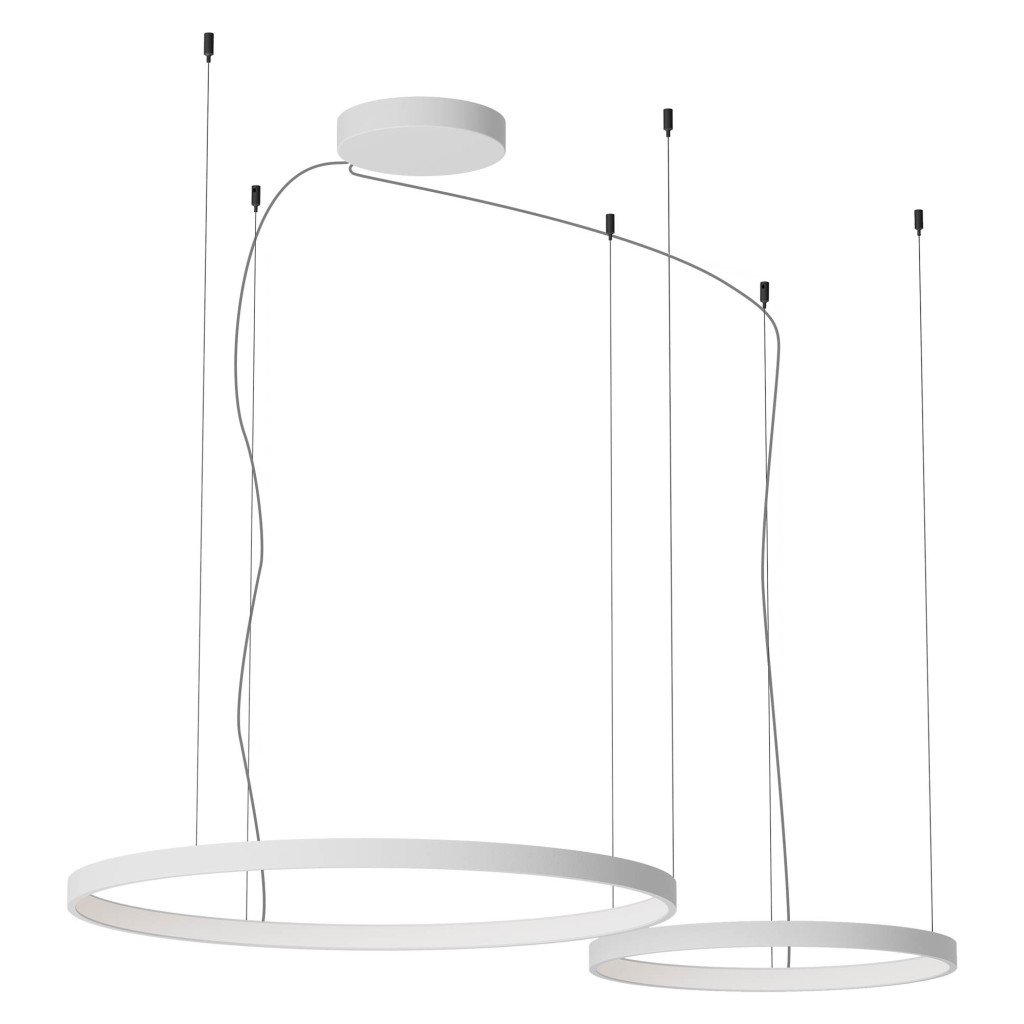 Kerek függesztett lámpa matt fehér színű fém és alumínium vázzal, 50 és 75cm átmérőjű opálos szilikon betétes búrával, beépített LED fényforrással. A lámpa színhőmérséklete állítható meleg, vagy természetes fehér (2700/3000/4000K) színre. Triac változat, egy külön vásárolható speciális kapcsoló segítségével fényerőszabályozható. A kapcsolóról érdeklődjön ügyfélszolgálatunkon.