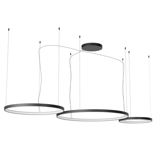 Kerek függesztett lámpa matt fekete színű fém és alumínium vázzal, 50, 75 és 100cm átmérőjű opálos szilikon betétes búrával, beépített LED fényforrással. A lámpa színhőmérséklete állítható meleg, vagy természetes fehér (2700/3000/4000K) színre. Triac változat, egy külön vásárolható speciális kapcsoló segítségével fényerőszabályozható. A kapcsolóról érdeklődjön ügyfélszolgálatunkon.