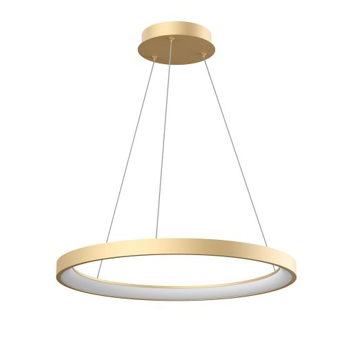 58cm átmérőjű, matt arany színű fém és alumínium vázas függesztett lámpa opálos acryl búrával, változtatható meleg, természetes fehér (3000/4000K) színhőmérsékletű beépített LED fényforrással. A lámpa fényereje fali kapcsoló fel/le kapcsolásával 3 lépcsőben szabályozható.