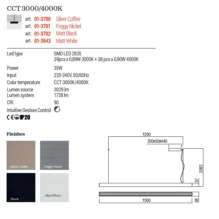 150cm hosszú, matt fehér színű alumínium függesztett lámpa szaténos műanyag betéttel, beépített LED fényforrással. A termék színhőmérséklete meleg vagy természetes fehér fényre változtatható illete a fényereje szabályozható érintés nélküli, intuitív gesztusos vezérléssel.
