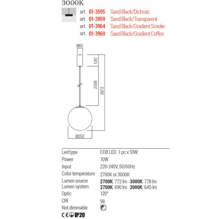 Fekete színű fém vázas függesztett lámpa 25cm átmérőjű, átlátszó üveg búrával, meleg fehér színhőmésrékletű beépített LED fényforrással, rövidíthető belógással. A lámpához külön vásárolható más mennnyezetrózsa, amivel akár 3-5-10-15 ágú függeszték is készíthető a lámpából.