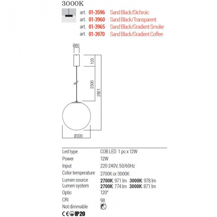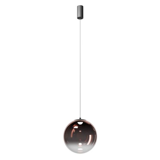Fekete színű fém vázas függesztett lámpa 30cm átmérőjű, fentről lefelé világosodó, kávé színű üveg búrával, meleg fehér színhőmésrékletű beépített LED fényforrással, rövidíthető belógással. A lámpához külön vásárolható más mennnyezetrózsa, amivel akár 3-5-10-15 ágú függeszték is készíthető a lámpából.