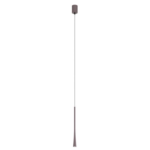 Matt kávé színű alumínium függesztett lámpa 40cm magas, 3,2cm átmérőjű búrával, alul a fény lágyítására szolgáló műanyag lappal. A lámpa extra meleg fehér színhőmérsékletű beépített LED fényforrással rendelkezik. A lámpához külön vásárolható más mennnyezetrózsa, amivel akár 3-5-10-15 ágú függeszték is készíthető a lámpából.
