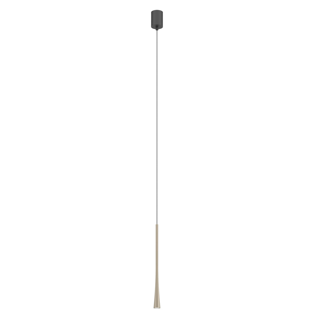 Ezüstös kávé színű alumínium függesztett lámpa 40cm magas, 3,2cm átmérőjű búrával, alul a fény lágyítására szolgáló műanyag lappal. A lámpa extra meleg fehér színhőmérsékletű beépített LED fényforrással rendelkezik. A lámpához külön vásárolható más mennnyezetrózsa, amivel akár 3-5-10-15 ágú függeszték is készíthető a lámpából.