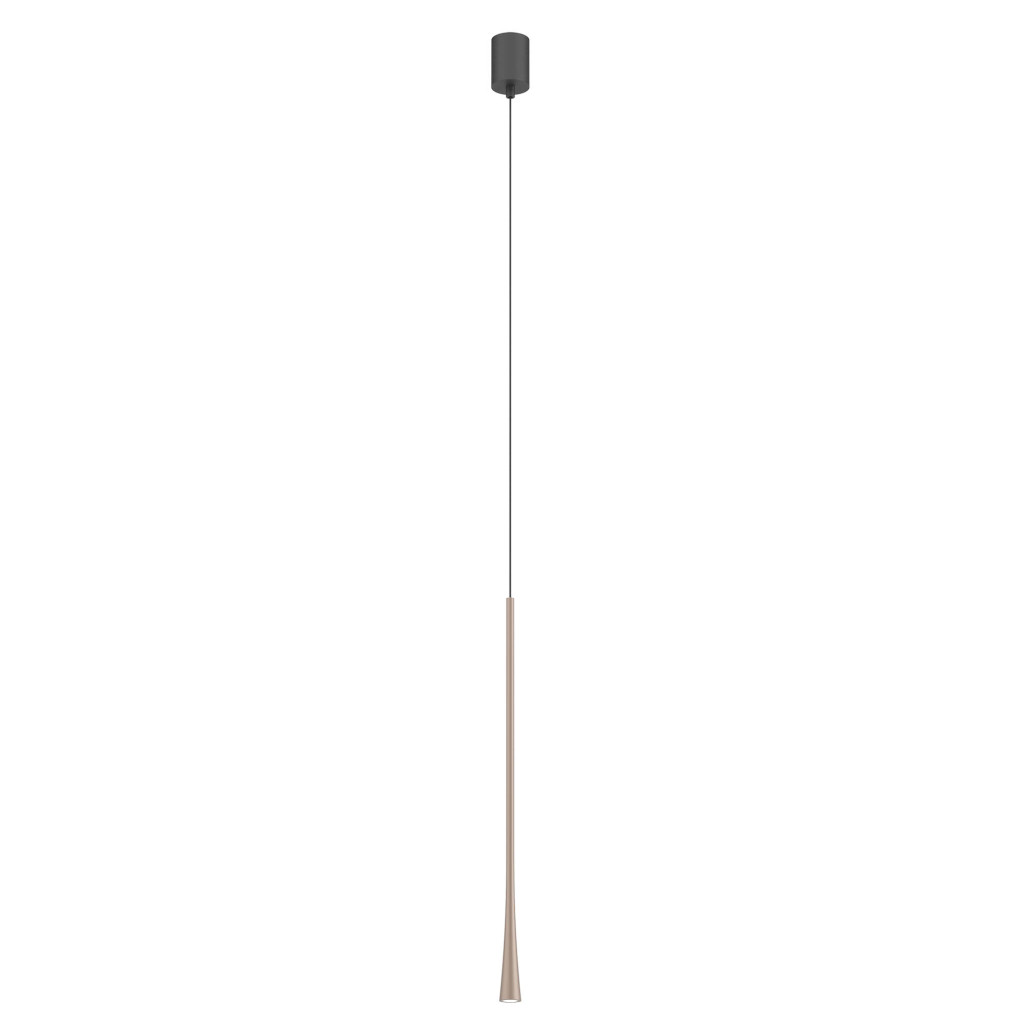 Ezüstös kávé színű alumínium függesztett lámpa 60cm magas, 3,2cm átmérőjű búrával, alul a fény lágyítására szolgáló műanyag lappal. A lámpa meleg fehér színhőmérsékletű beépített LED fényforrással rendelkezik. A lámpához külön vásárolható más mennnyezetrózsa, amivel akár 3-5-10-15 ágú függeszték is készíthető a lámpából.