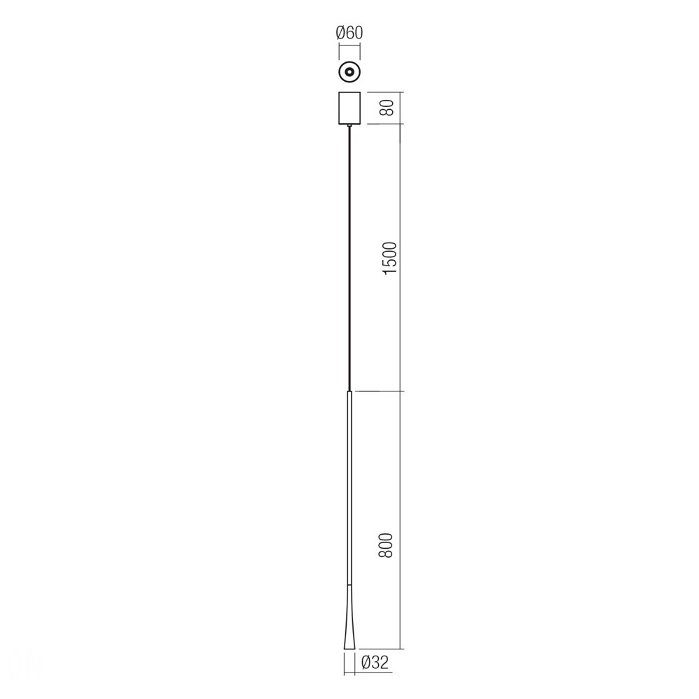 Matt fekete színű alumínium függesztett lámpa 80cm magas, 3,2cm átmérőjű búrával, alul a fény lágyítására szolgáló műanyag lappal. A lámpa extra meleg fehér színhőmérsékletű beépített LED fényforrással rendelkezik. A lámpához külön vásárolható más mennnyezetrózsa, amivel akár 3-5-10-15 ágú függeszték is készíthető a lámpából.