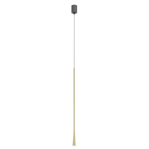 Matt arany színű alumínium függesztett lámpa 80cm magas, 3,2cm átmérőjű búrával, alul a fény lágyítására szolgáló műanyag lappal. A lámpa extra meleg fehér színhőmérsékletű beépített LED fényforrással rendelkezik. A lámpához külön vásárolható más mennnyezetrózsa, amivel akár 3-5-10-15 ágú függeszték is készíthető a lámpából.