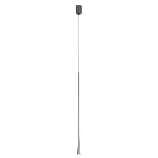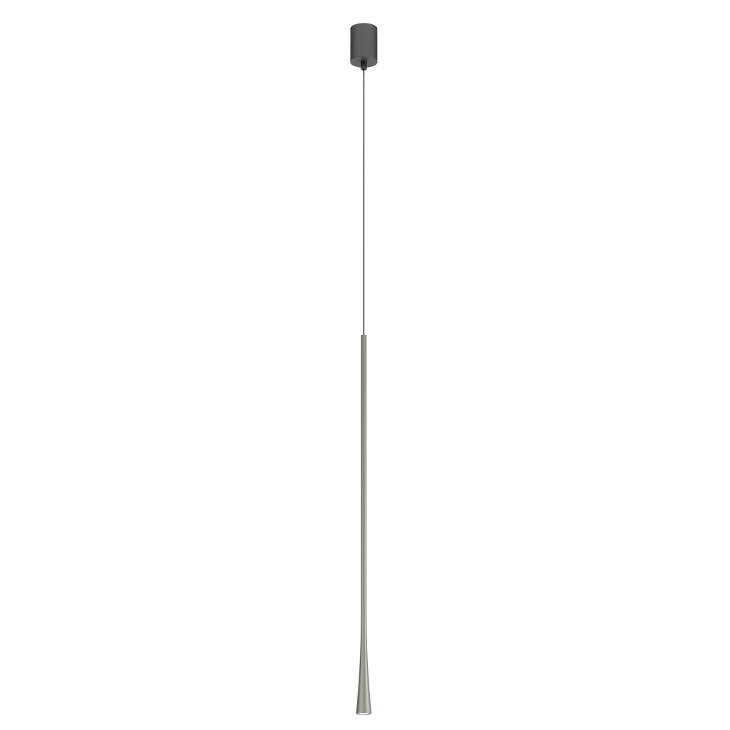 Ködös nikkel színű alumínium függesztett lámpa 80cm magas, 3,2cm átmérőjű búrával, alul a fény lágyítására szolgáló műanyag lappal. A lámpa extra meleg fehér színhőmérsékletű beépített LED fényforrással rendelkezik. A lámpához külön vásárolható más mennnyezetrózsa, amivel akár 3-5-10-15 ágú függeszték is készíthető a lámpából.