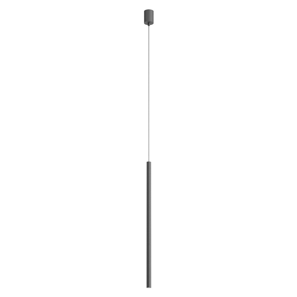 Matt fekete színű alumínium függesztett lámpa 75cm magas, 2,5cm átmérőjű búrával, alul a fény lágyítására szolgáló műanyag lappal. A lámpa meleg fehér színhőmérsékletű beépített LED fényforrással rendelkezik. A lámpához külön vásárolható más mennnyezetrózsa, amivel akár 3-5-10-15 ágú függeszték is készíthető a lámpából.