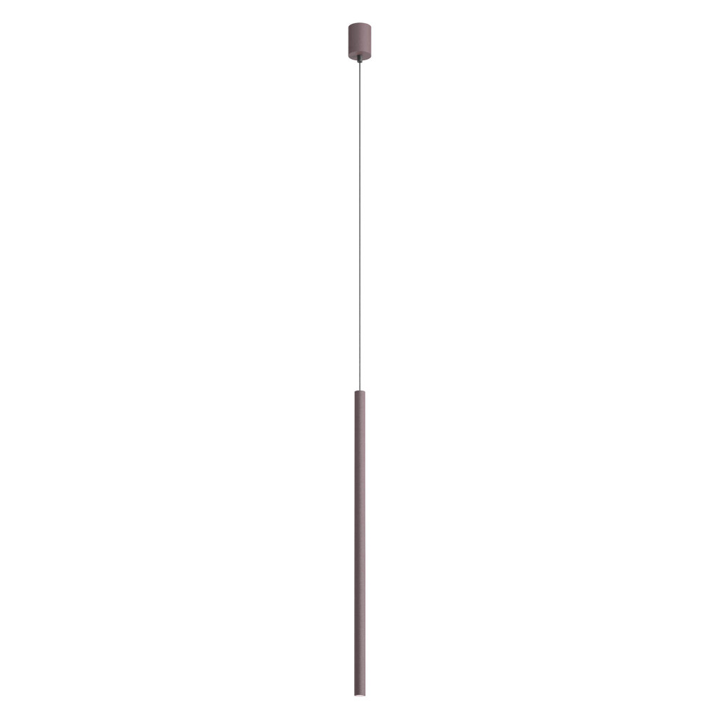 Matt kávé színű alumínium függesztett lámpa 75cm magas, 2,5cm átmérőjű búrával, alul a fény lágyítására szolgáló műanyag lappal. A lámpa extra meleg fehér színhőmérsékletű beépített LED fényforrással rendelkezik. A lámpához külön vásárolható más mennnyezetrózsa, amivel akár 3-5-10-15 ágú függeszték is készíthető a lámpából.