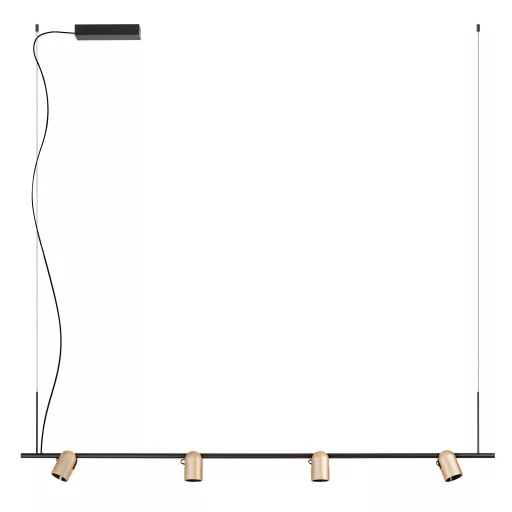 Matt fekete színre festett fém és alumínium vázas függesztett spot lámpa billenthető, ezüstös kávé színű fejjel, polikarbonát betéttel, extra meleg fehér színhőmérsékletű beépített LED fényforrással. Triac változat, egy külön vásárolható speciális kapcsoló segítségével fényerőszabályozható. A kapcsolóról érdeklődjön ügyfélszolgálatunkon.