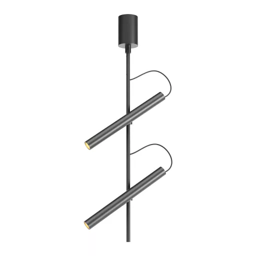 Matt fekete színű fém és alumínium mennyezeti lámpa 2db állítható fejjel, meleg fehér (2700K) színhőmérsékletű beépített LED fényforrással. Triac változat, egy külön vásárolható speciális kapcsoló segítségével fényerőszabályozható. A kapcsolóról érdeklődjön ügyfélszolgálatunkon.