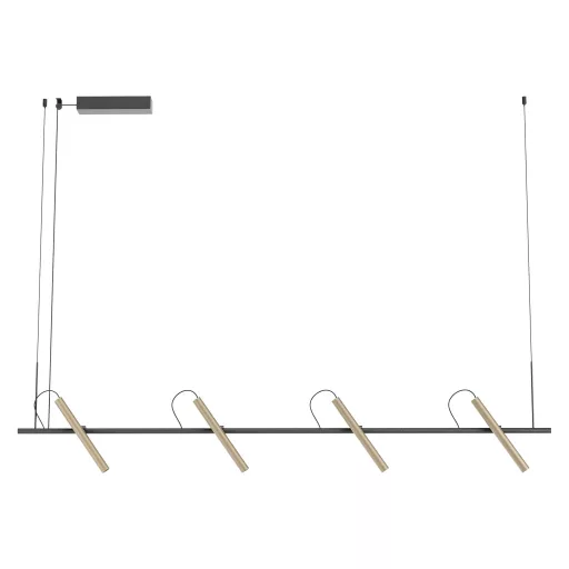Matt fekete és ezüstös kávé színű fém és alumínium függesztett lámpa 4db állítható fejjel, meleg fehér (2700K) színhőmérsékletű beépített LED fényforrással. Triac változat, egy külön vásárolható speciális kapcsoló segítségével fényerőszabályozható. A kapcsolóról érdeklődjön ügyfélszolgálatunkon.