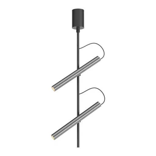 Matt fekete és ködös nikkel színű fém és alumínium mennyezeti lámpa 2db állítható fejjel, meleg fehér (2700K) színhőmérsékletű beépített LED fényforrással. Triac változat, egy külön vásárolható speciális kapcsoló segítségével fényerőszabályozható. A kapcsolóról érdeklődjön ügyfélszolgálatunkon.