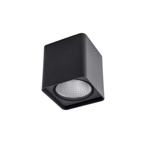 Sötét szürke színűre festett alumínium vázas kültéri mennyezeti lámpa áttetsző üveg betétes búrával és IP54-es védelemmel és nagy fényerősségű beépített LED fényforrással.