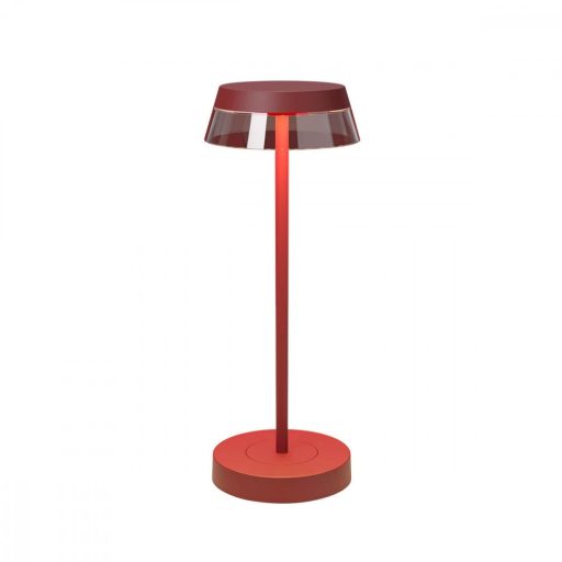 Piros színű alumínium kültéri asztali lámpa 2,5W beépített meleg fehér fényű LED fényforrással, átlátszó polikarbonát betétes búrával. A lámpa érintőkapcsolós. A talpat megérintve ki- és bekapcsolható, választható a színhőmérséklete 2700-3000K között, illetve 5-100% között állítható a fényerő. A lámpához USB csatlakozós töltő tartozik. Teljes töltési idő 5,5 óra, az üzemidő pedig 7,5 óra. A lámpa IP65-ös védelemmel rendelkezik.