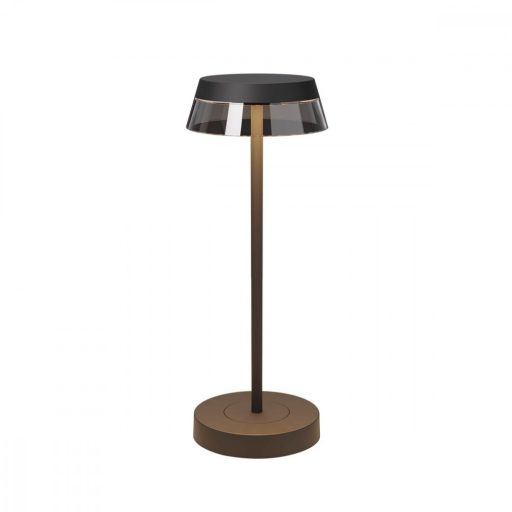Matt fekete színű alumínium kültéri asztali lámpa 2,5W beépített meleg fehér fényű LED fényforrással, átlátszó polikarbonát betétes búrával. A lámpa érintőkapcsolós. A talpat megérintve ki- és bekapcsolható, választható a színhőmérséklete 2700-3000K között, illetve 5-100% között állítható a fényerő. A lámpához USB csatlakozós töltő tartozik. Teljes töltési idő 5,5 óra, az üzemidő pedig 7,5 óra. A lámpa IP65-ös védelemmel rendelkezik.