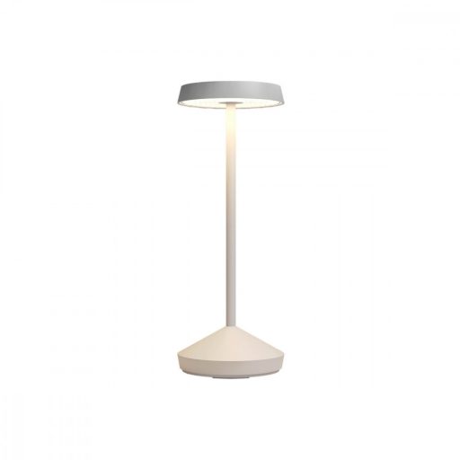 Matt fehér színű alumínium kültéri asztali lámpa 2,2W beépített meleg fehér fényű LED fényforrással, polikarbonát betéttel. A lámpa érintőkapcsolós. A búra tetejét megérintve ki- és bekapcsolható, választható a színhőmérséklete 2700-3000K között, illetve 5-100% között állítható a fényerő. A lámpához USB csatlakozós töltő tartozik. Teljes töltési idő 6 óra, az üzemidő pedig 9 óra. A lámpa IP65-ös védelemmel rendelkezik.