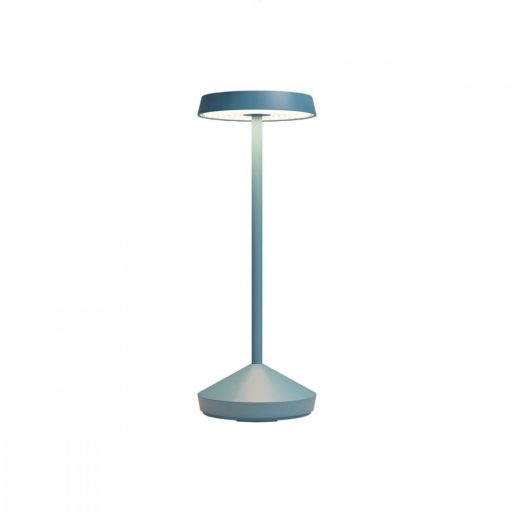 Kék színű alumínium kültéri asztali lámpa 2,2W beépített meleg fehér fényű LED fényforrással, polikarbonát betéttel. A lámpa érintőkapcsolós. A búra tetejét megérintve ki- és bekapcsolható, választható a színhőmérséklete 2700-3000K között, illetve 5-100% között állítható a fényerő. A lámpához USB csatlakozós töltő tartozik. Teljes töltési idő 6 óra, az üzemidő pedig 9 óra. A lámpa IP65-ös védelemmel rendelkezik.
