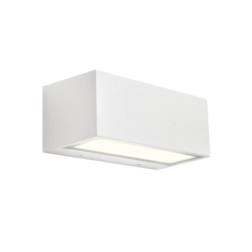 Matt fehér színű alumínium kültéri fali lámpa meleg fehér színhőmérsékletű beépített LED fényforrással, IP65-ös és IK06-os védelemmel, szatinált üveg betéttel. A lámpa felfelé és lefelé egyaránt világít.
