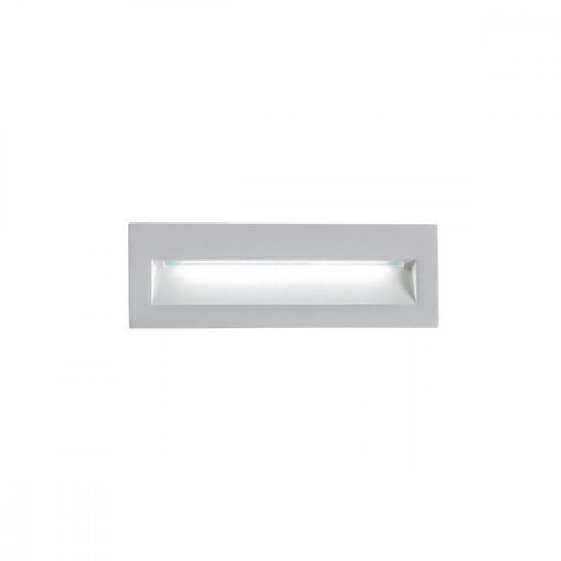Matt fehér színű alumínium kültéri falba épethető lámpa üveg betéttel, LED fényforrással és beépített müködtetővel, IP54-es védelemmel.