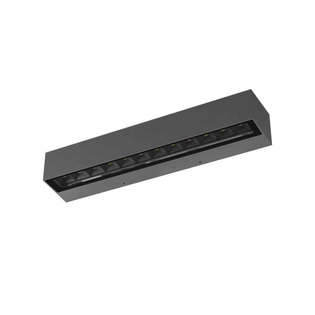 Sötét szürke színre festett alumínium kültéri fali lámpa alul polikarbonát és üveg betéttel, meleg fehér színhőmérsékletű beépített LED fényforrással, IP65-ös védelemmel.