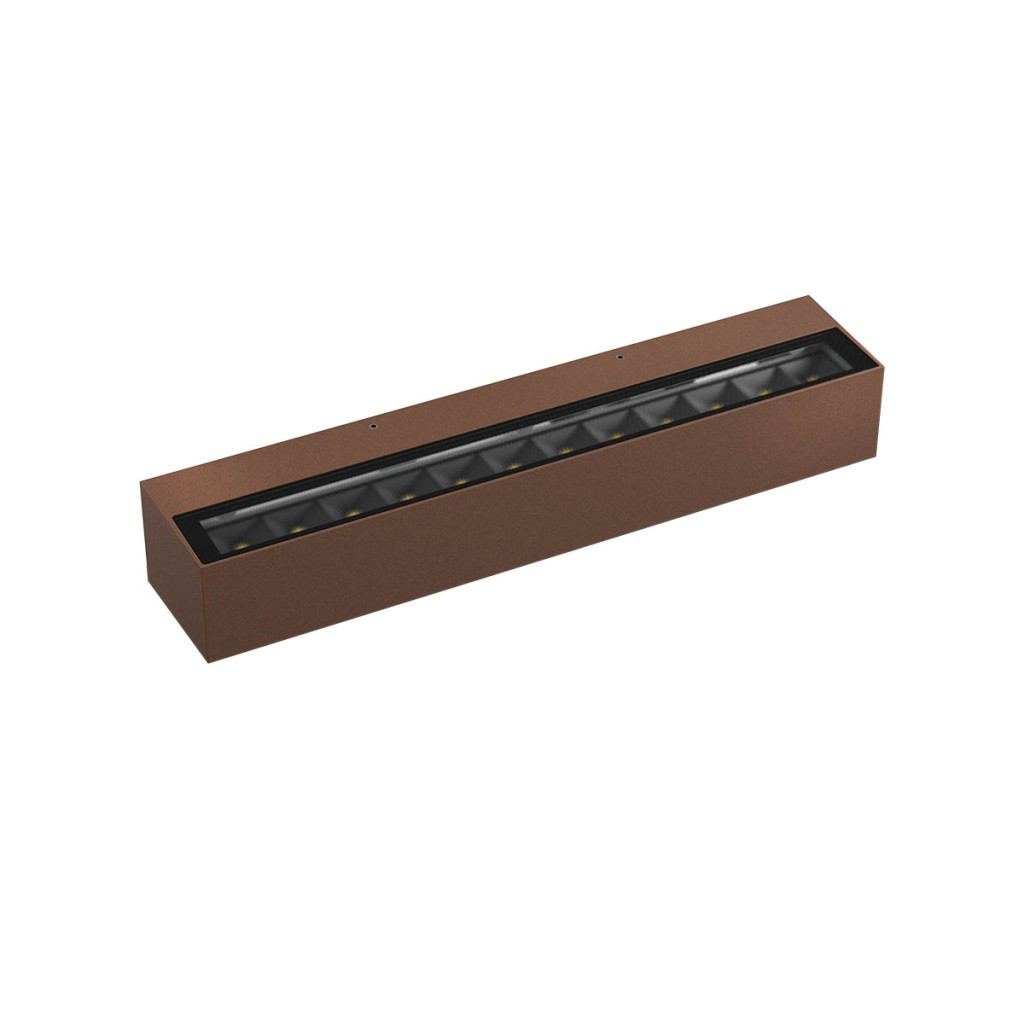 Rozsdabarna színre festett alumínium kültéri fali lámpa alul polikarbonát és üveg betéttel, meleg fehér színhőmérsékletű beépített LED fényforrással, IP65-ös védelemmel. A lámpa felfelé és lefelé egyaránt világít.