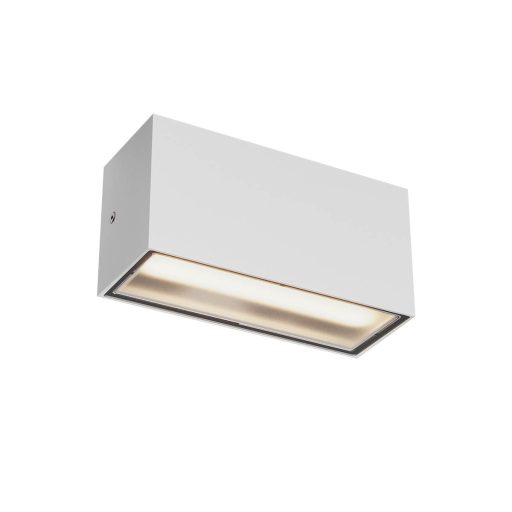 Matt fehér színű alumínium kültéri fali lámpa meleg fehér színhőmérsékletű beépített LED fényforrással, IP65-ös és IK06-os védelemmel, szatinált üveg betéttel. A LED színhőmérséklete a lámpatesten állítható 2700 vagy 3000Kelvinre. A lámpa Dali világításvezérelt hálózatra kötve fényerőszabályozható. Dali rendszer különálló lámpák és világítási csoportok vezérlésére alkalmas rendszer. Ennek kiépítéséről kérje villanyszerelő szakember segítségét.