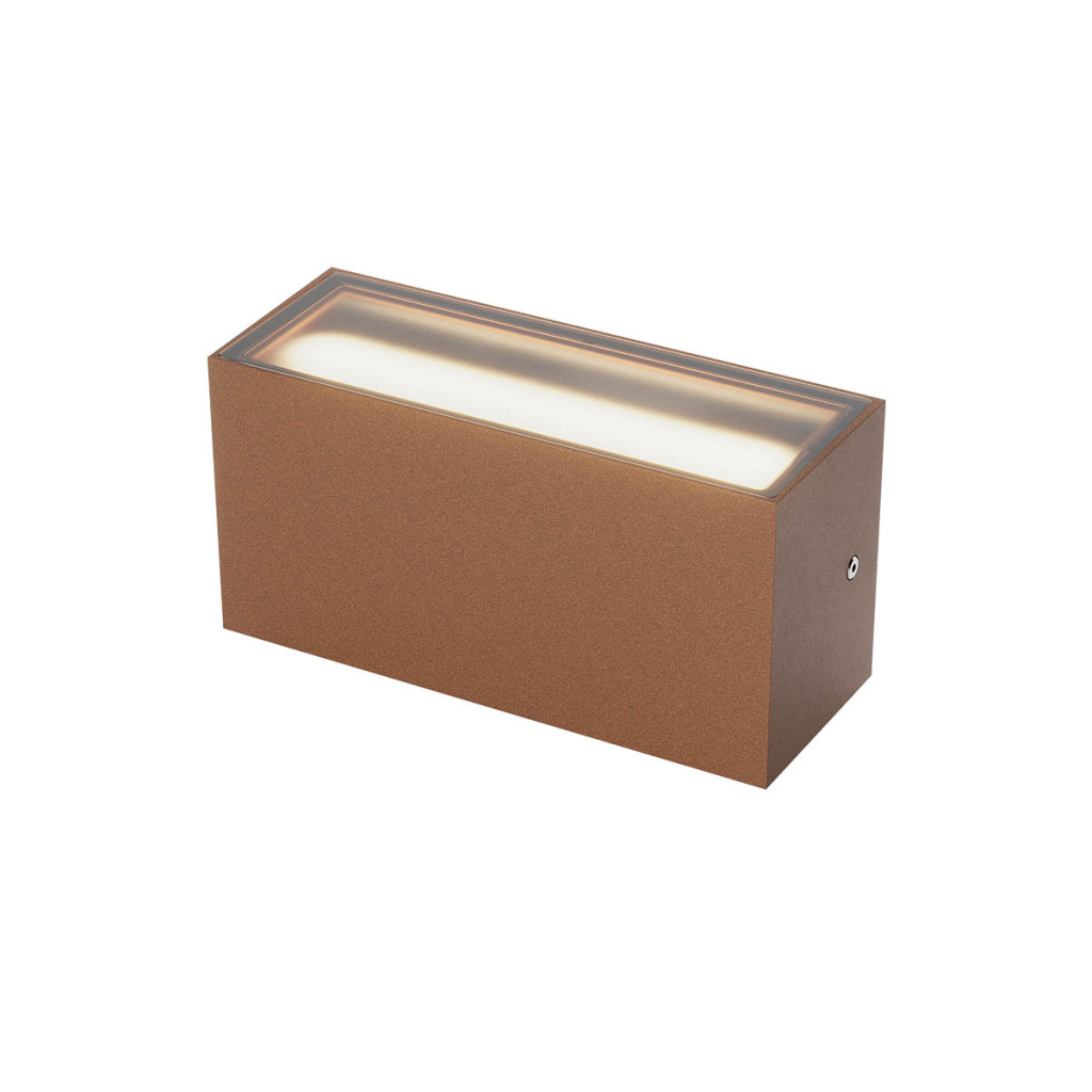 Rozsdabarna színű alumínium kültéri fali lámpa meleg fehér színhőmérsékletű beépített LED fényforrással, IP65-ös és IK06-os védelemmel, szatinált üveg betéttel. A LED színhőmérséklete a lámpatesten állítható 2700 vagy 3000Kelvinre. A lámpa felfelé és lefelé egyaránt világít.