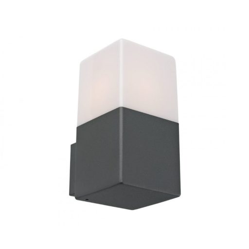 Modern stílusú, kültéri fali lámpa, sötét szürkére festett alumínium szerkezettel, opálos polikarbonát betétes búrával, IP44-es védelemmel.