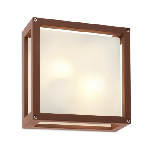 Modern stílusú, kültéri fali/mennyezeti lámpa, rozsdabarnára festett alumínium szerkezettel, szatinált üveg betétes búrával, IP54-es védelemmel.