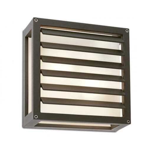 Modern stílusú, kültéri fali lámpa, sötét szürkére festett alumínium szerkezettel, szatinált üveg betétes búrával, IP54-es védelemmel.
