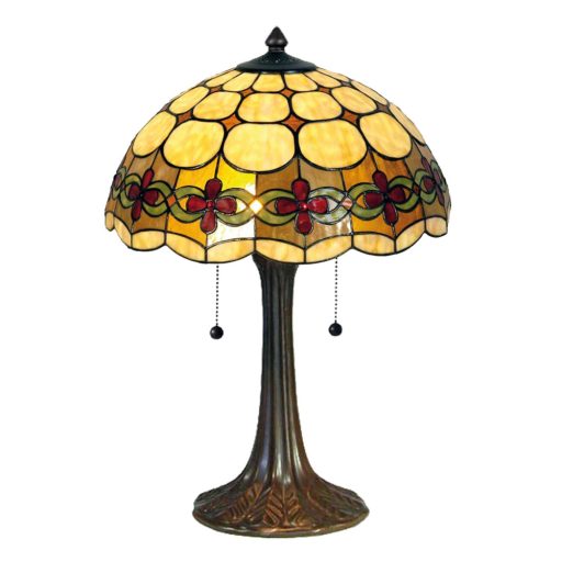 Bronzos barna színű polyresin vázas komód lámpa 40cm átmérőjű, bézses árnyalatú alapon virág dekoros Tiffany üveg búrával, húzókapcsolóval. A lámpában 2db külön kapcsolható E27-es foglalat található.