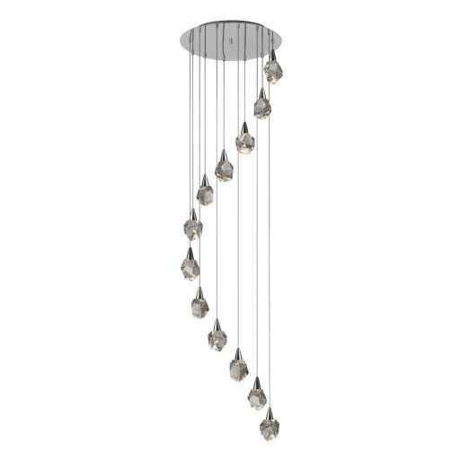 Króm színű fém vázas függeszték lámpa 12db sokszögletű, belül buborék dekoros üveg búrával, meleg fehér színhőmérsékletű beépített LED fényforrással. A lámpa belógása felszereléskor 150-500cm között állítható.
