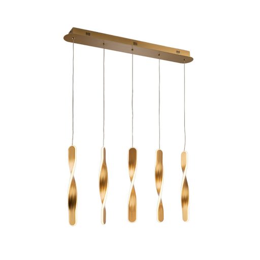 Légies megjelenésű függeszték lámpa súrolt arany színű fém mennyezet rózsával és arany színű fém csavart búrával, opálos szilikon peremmel, meleg fehér színhőmérsékletű beépített LED fényforrással. A lámpa belógása felszereléskor 55-130cm között állítható.