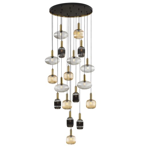 Monumentális, matt fekete és szatinált sárgaréz színű fém vázas függeszték lámpa hosszanti bordázott(összesen 18db), átlátszó, borostyán, tükrözödő felületű füstszínű üveg búrákkal. A lámpa 18db E27-es foglalattal rendelkezik. A lámpát 8W 2700K LED fényforrással szállítjuk. A lámpa belógása felszereléskor 150-500cm között állítható. Galériás terekbe kiváló megoldás.