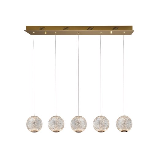 Arany színű fém vázas függeszték lámpa 5db 11cm átmérőjű, gömb szerű búrával, kristály hatású metszett acryl búrával, meleg fehér színhőmérsékletű beépített LED fényforrással. A lámpa belógása felszereléskor 25-150cm között állítható.