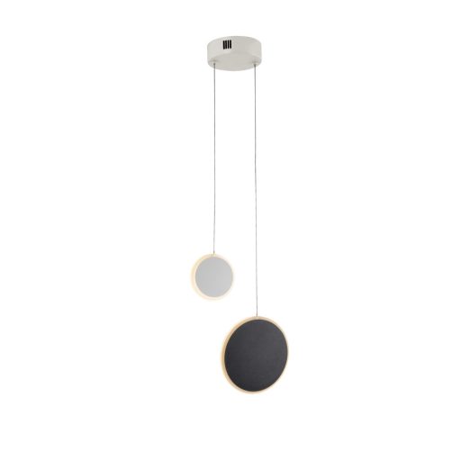 Dekorációs függeszték lámpa egy fehér és egy fekete korong alakú fejjel. A korong feremén található acryl búrán keresztül meleg fehér színhőmérsékletű beépített LED fényforrás világít. A lámpa felszerelésekor a belógás állítható 40-120cm között.
