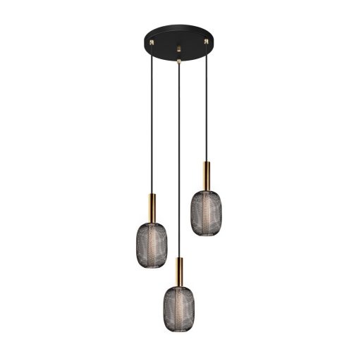 Fekete és fényes arany színű fém vázas függeszték lámpa kívül fekete színű fémrács búrával, belül buborékos acryl betéttel, meleg fehér színhőmérsékletű beépített LED fényforrással. A lámpa fényereje szabályozható arra alkalmas fali kapcsoló segítségével. A lámpa belógása felszereléskor 65-145cm között állítható.