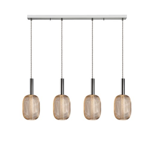 Fényes króm színű fém vázas függeszték lámpa kívül arany színű fémrács búrával, belül buborékos acryl betéttel, meleg fehér színhőmérsékletű beépített LED fényforrással. A lámpa fényereje szabályozható arra alkalmas fali kapcsoló segítségével. A lámpa belógása felszereléskor 45-145cm között állítható.