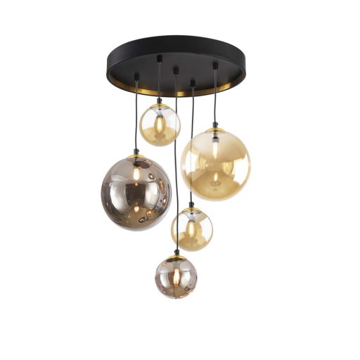 Matt fekete alapon szatinált sárgaréz dekoros fém vázas függeszték lámpa 12 és 20cm átmérőjű gömb alakú, borostyán és füstszínű üveg búrával, G9-es foglalattal. A lámpát cserélhető 4W 3000K G9-es LED fényforrással szállítjuk. A lámpa belógása felszereléskor 50-200cm között állítható.