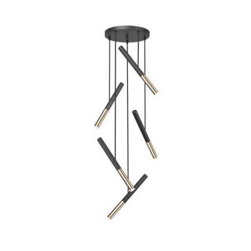Matt fekete és fényes arany színű fém függeszték lámpa meleg fehér színhőmérsékletű beépített LED fényforrással. A lámpa belógása felszereléskor 85-200cm között állítható.