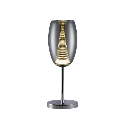 Króm színű fém vázas asztali lámpa kívül csillámló üveg, belül tölcsér alakú polikarbonát búrával, meleg fehér színhőmérsékletű beépített LED fényforrással.